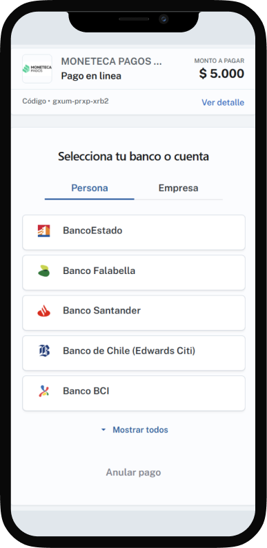 At LaFinteca, we offer KHIPU in Chile, a trusted and simplified bank transfer solution delivered through our integrated API. KHIPU is the secure, local payment system that allows your customers to pay directly from any major Chilean bank account. This seamless integration eliminates friction and offers a fast, secure, and intuitive process, resulting in instant payment confirmation. Your customers simply select their bank from the KHIPU payment interface and complete the transaction directly within their familiar online banking environment.